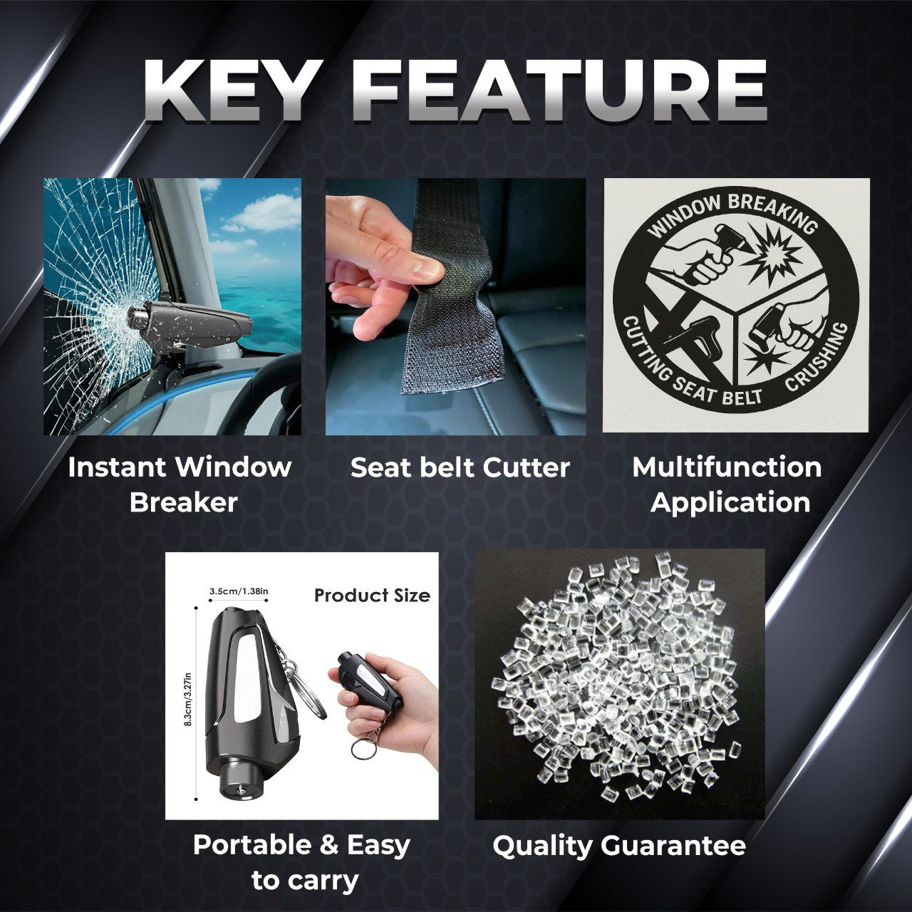 - Seatbelt Cutter – Razor-sharp concealed blade slices through jammed seatbelts in seconds.
