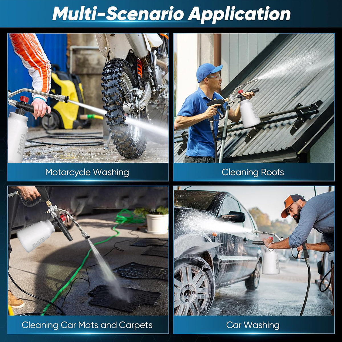 Skip the expensive car wash—use the TLOPA® Foam Cannon Dual Connector Accessory! Switch between foam and rinse in one second by one button, no disassembly. Bear up to 3000PSI pressure, Car washing efficiency greatly improved by 200%, save much money and time! Fits most pressure washers to clean cars, patios, siding & more.