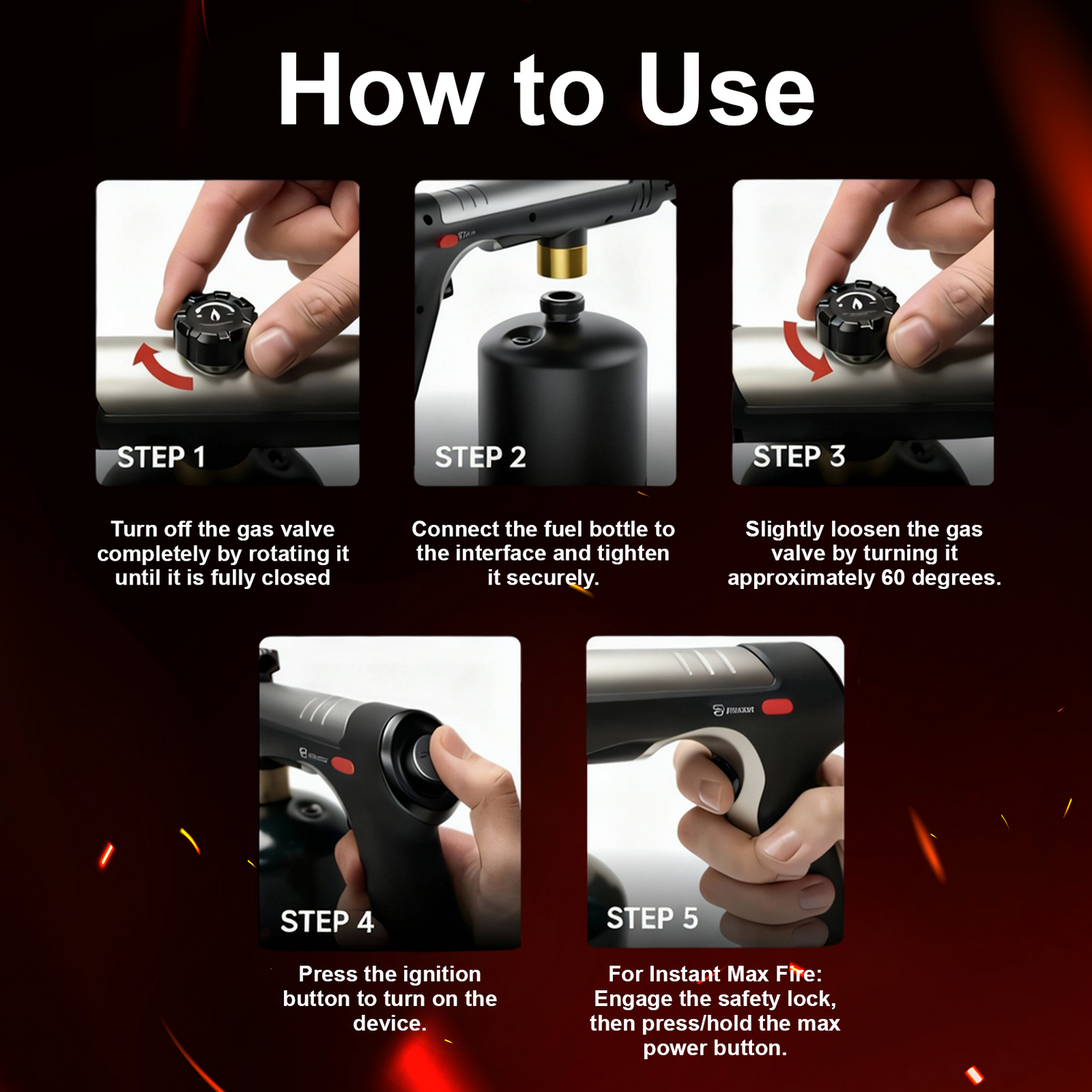 5. Engage the safety lock, press/hold the max power button for Instant Max Fire.
