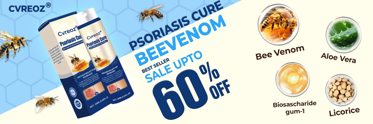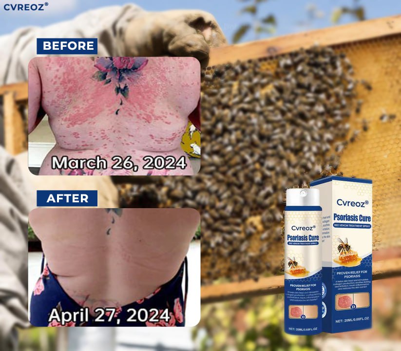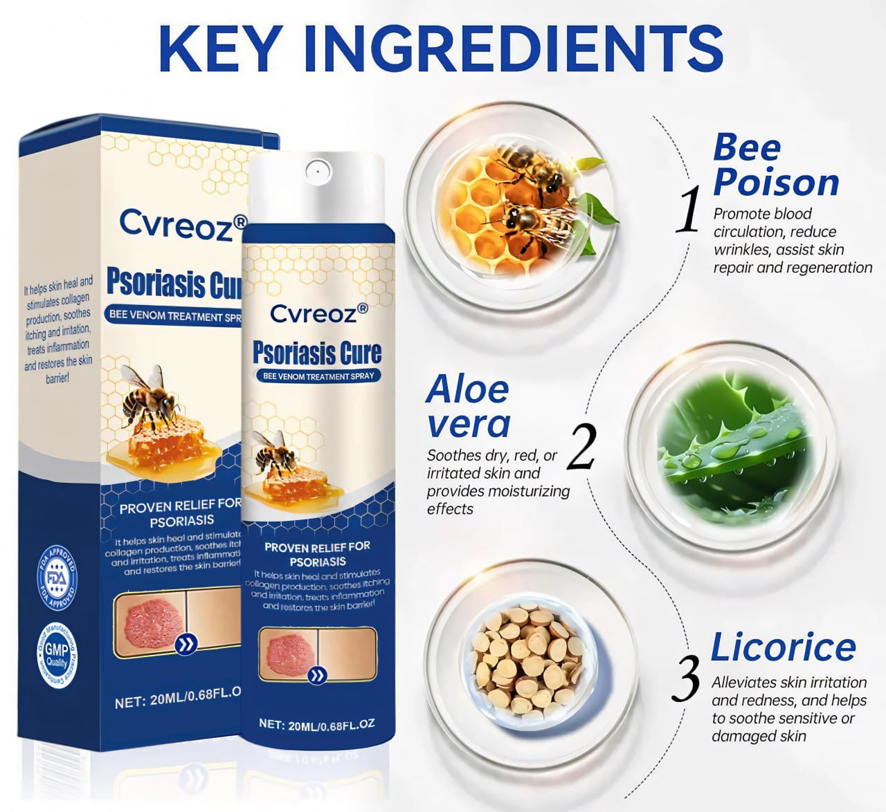 "Cvreoz® Psoriasis Cure Bee Venom Treatment Spray uses purified bee venom, shown in studies to have antiviral and anti-inflammatory effects. It helps prevent infection during flare-ups and supports the natural removal of damaged skin by promoting cell turnover and targeting abnormal skin cells.